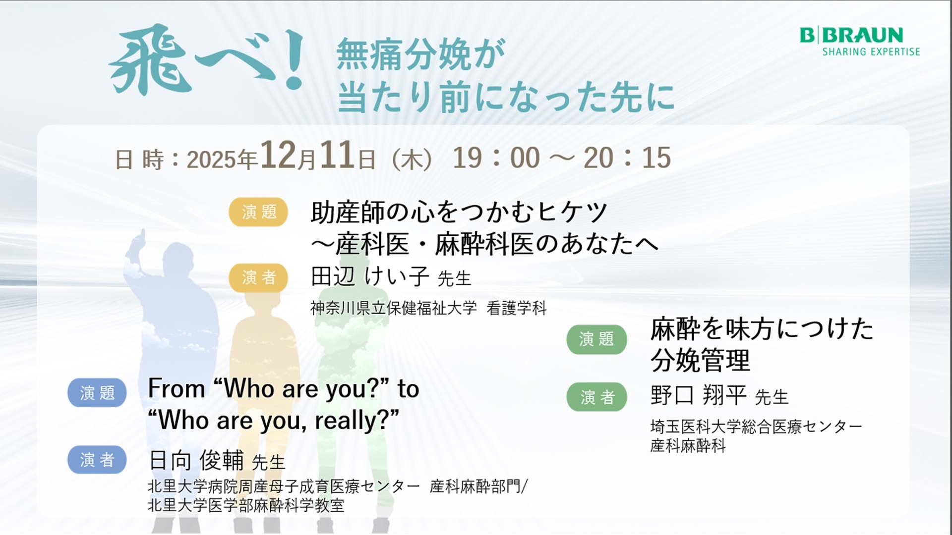 本セミナーでは3名の先生方より、無痛分娩にまつわる分娩・麻酔管理、多職種連携など幅広い知見と現場に近い立場からご教授いただきます。